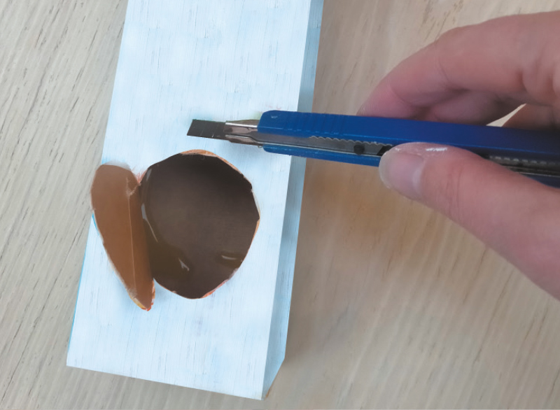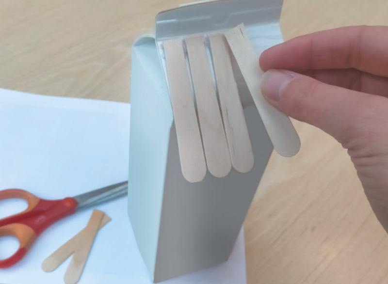 En bas de la brique, avec l’aide d’un adulte, découpe au cutter un rond assez grand pour qu’un oiseau puisse y entrer (diamètre 4 cm).