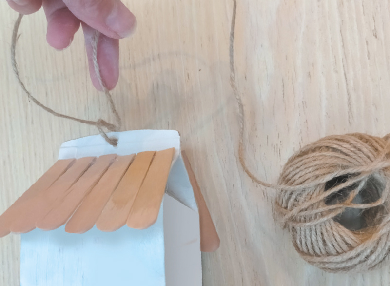 Perce le haut de la brique et attache un morceau de ficelle afin de pouvoir suspendre ta mangeoire.