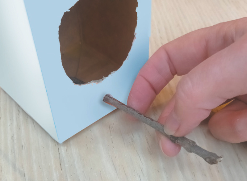 Insère la petite branche sous l’ouverture en perçant les 2 côtés de la brique. Cela sera le perchoir !
